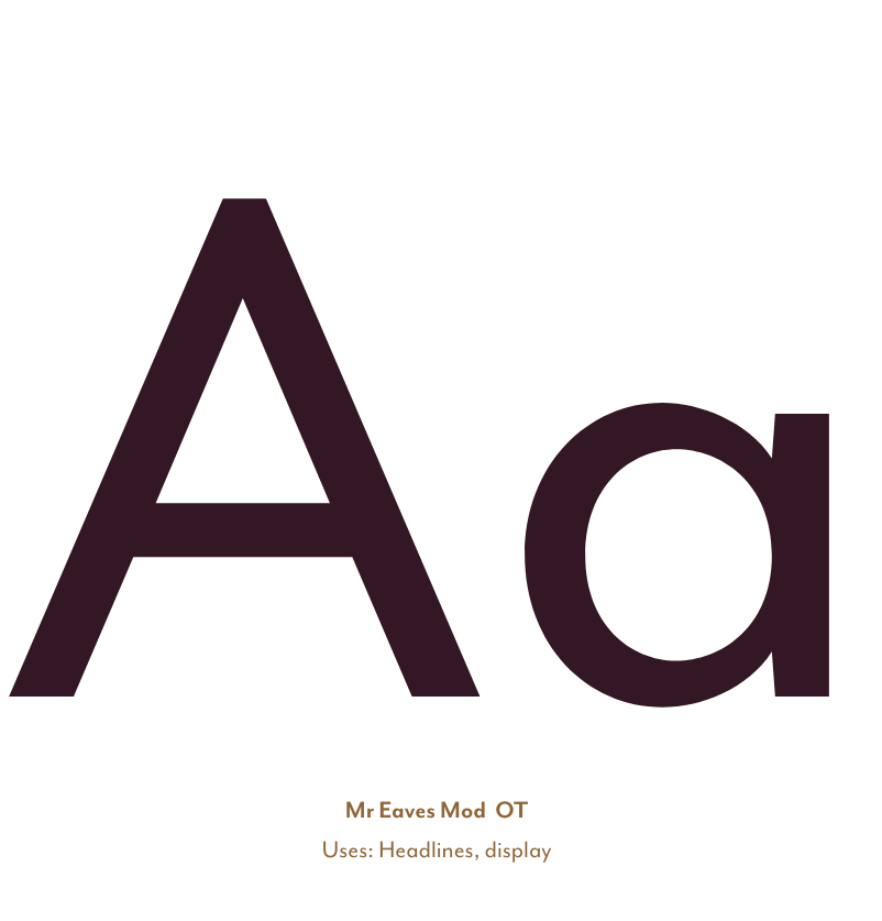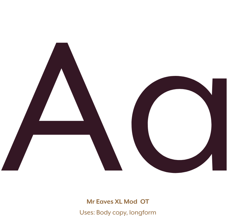 Mr Eaves Mod OT and XL Mod OT pair to create a robust and flexible type system for the Asymmetria brand. Both families are crisp and clean, with subtle contrast that prodvides modenr character and visual interest. Mr Eaves Mod OT is well suited for display type and headlines, confidently capturing attention. The XL Mod OT family was not only created for, but also ideal as body copy, longform details and small point sizes (like x- and y-axis information on charts and graphs).